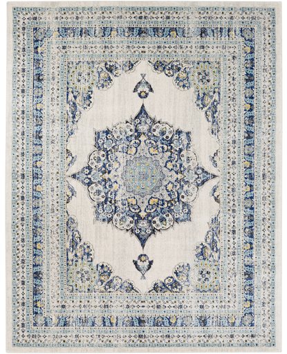 A machine woven rug in tones of beige and blue.Read More
