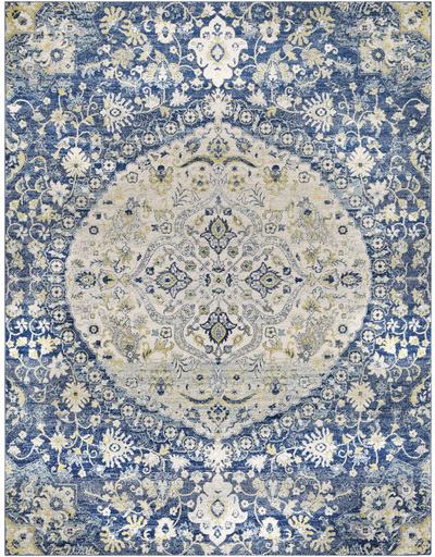 A machine woven rug in tones of blue, yellow, and ivory.Read More